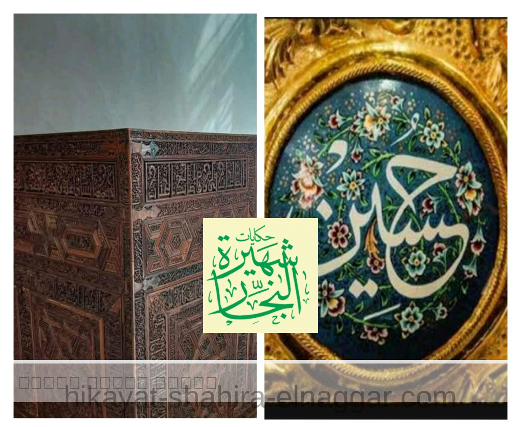 «و أهم ما بقي من المشهد القديم التابوت الخشبي الذي كان محتجباً تحت المقصورة و هو تابوت يزري بالذهب و الفضة و قد أتاح لي صاحب الجلالة الملك فاروق الأول عام 1939م بإستبدال البلاطات الخزفية التي بأرضية المقصورة النحاسية بالرخام و قد انتهزت الفرصة و هبطت إلى أسفل المقصورة فوجدت تابوت خشبي قد دب التلف إلى أجزائه فرفعت مذكرة إلى لجنة حفظ الآثار العربية فقامت بترميمه ثم نقلته إلى دار الآثار العربية “متحف الفن الإسلامي حالياً”عام 1945م» ، و قد أحيطت الحشوات المسدسة بقوائم و أفاريز كتب فيها بالخط الكوفي البسيط كلمات منها « الملك لله ،و ماتوفيقي إلا بالله ،ثقتي بالله ، نصر من الله و فتح قريب ، الملك لله ،العزة لله ، التوفيق بالله ، و ما بكم من نعمة فمن الله» ، كما يوجد كتابات على الوجه بالسطر العلوي بالخط الكوفي البسيط « بسم الله الرحمن الرحيم رحمة الله و بركاته عليكم أهل البيت إنه حميد مجيد ،إنما يريد الله ليذهب عنكم الرجس أهل البيت و يطهركم تطهيرا » ، و مكتوب بالسطر السفلي بالقوائم المحيطة بالمستطيلات المكتوبة و المنقوشة « بسم الله الرحمن الرحيم الله لا إله إلا هو الحي القيوم » ، و قوله تعالى « الله نور السموات و الأرض » ، و مكتوب بالخط الكوفي حول المصراع المربع الأوسط « بسم الله الرحمن الرحيم و قالوا الحمد لله الذي صدقنا وعده و أورثنا الأرض نتبوأ من الجنة حيث نشاء فنعم أجر العاملين » ، و القسم الأسفل من هذا الجنب مقسم إلى ثلاثة مستطيلات مكتوب حولها بالخط الكوفي المزهر « بسم الله الرحمن الرحيم إن الذين اتقوا إذا مسهم طائف من الشيطان تذكروا فإذا هم مبصرون إلى قوله هذا بصائر من ربكم و هدى و رحمة» ، كما توجد كتابه على الجانب الأيمن للتابوت بالخط الكوفي الصفير البسيط بالسطر العلوي « بسم الله الرحمن الرحيم إن الذين آمنوا و عملوا الصالحات أولئك هم خير البرية إلى قوله رضي الله عنهم و رضوا عنه» ، و مكتوب بالخط الكوفي المزهر« بسم الله الرحمن الرحيم رحمة الله و بركاته عليكم أهل البيت » ، و مكتوب بالسطر أعلاه و أسفله و بالسطر أسفل الحشوات المسدسة و النجمية بالخط النسخ الأيوبي « يا أيها الذين آمنوا اذكروا الله ذكراً كثيراً و سبحوه بكرة و أصيلا إلى قوله يا أيها النبي إنا أرسلناك شاهدا و مبشرا و نذيرا و داعيا إلى الله بإذنه و سراجا منيرا».